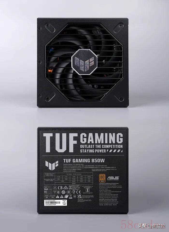 风扇位置,采用八边形镂空设计,对应形状的钢丝风扇罩及轴心 TUF 装饰标志,风扇采用 135mm 双滚珠轴承的轴流风扇,有着更好的散热及静音表现。另值得一提的是内 PCB 采用保护性涂层设计,更具耐用性,不惧潮湿天气,还有小强乱入。对应另一面规格贴标,80PLUS 金牌认证,+5V 和 +3.3V 输出电流 25A,合计输出 130W,+12V 输出电流 70.8A,提供最大 850W 的功率,其它方面,带有 OPP/OVP/UVP/SCP/OCP/OTP 保护功能,采用低 ESR 日系电容可提升效率并减少发热源,降低噪音以及提高可靠性与稳定性,另获得了 iST 宜特检测实验室多项测试认证。