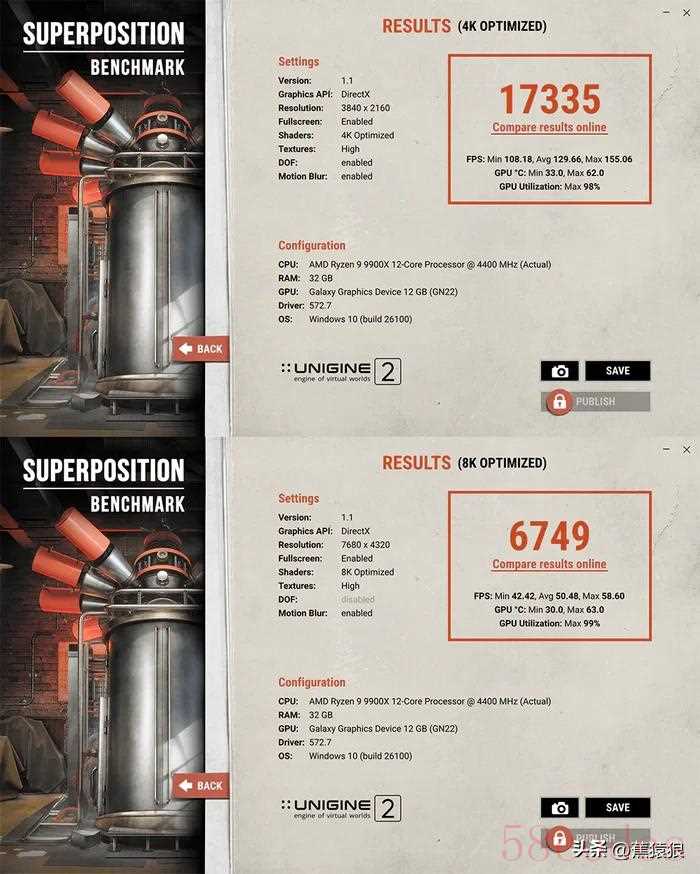 SUPERPOSITION BENCHMARK 测试,4K 模式下 17335 分,8K 模式下 6749 分。