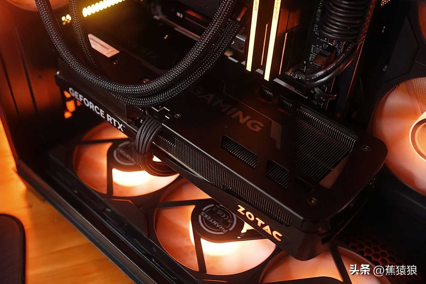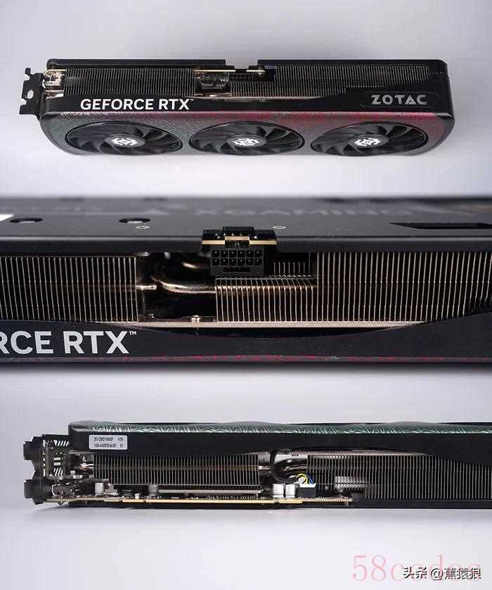 显卡侧面采用流线型线条,增强视觉上的活力,右下沿配备了 ZOTAC LOGO 信仰灯,左下沿则是 NV 强制的 GEFORCE RTX 标识。此外,接口位置的轮毂做了凹陷处理,易于保持供电线的弧度,确保 12V-2×6 供电的安全与稳定,且内收看着貌似也会更加的美观。显卡两侧均为采用大面积的鳍片外露,增强散热效率,显卡风扇的插头设计在底部,这样正侧面看着会比较的清爽。