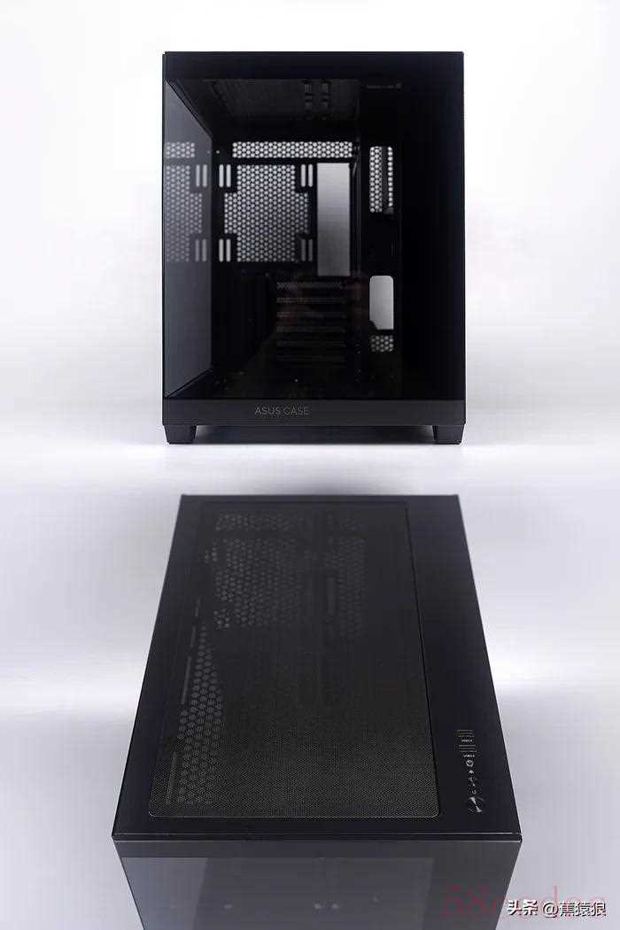 正面玻璃下沿配有 ASUS CASE 标识示意点缀。上置 I/O 接口,给到两个 USB 3.0 接口,音频复合接口,重启按键和开机按键( 另有 Type-C 版本可选 )。上下的风扇安装位均采用磁吸式防尘网覆盖。