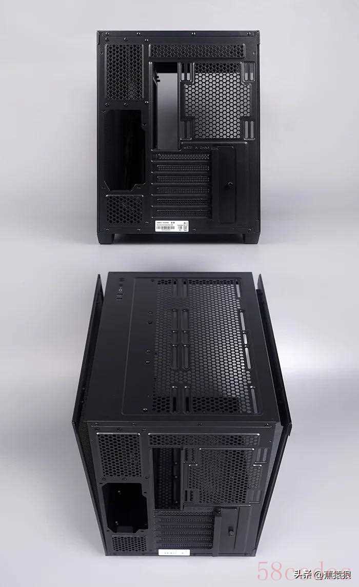 机箱尾部同样也是蜂窝式大散热开孔设计,支持安装一个 120/140mm 风扇排风,给到了 7 个 PCI 卡槽规模。双仓式设计,背部一侧为独立的硬件与电源安装位,机箱两侧板均采用了面螺丝卡扣固定,拆装非常的方便快捷。