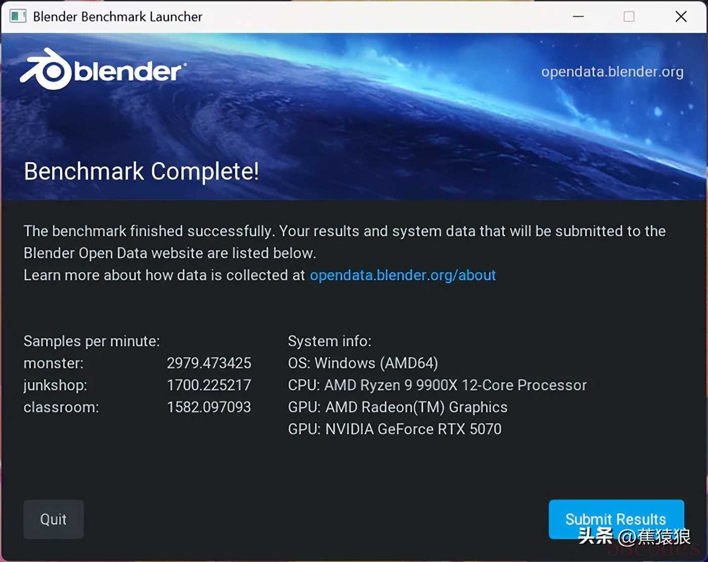 Blender 测试得分,MONSTER 场景 2979 分、JUNKSHOP 场景 1700 分、 CLASSROOM 场景 1582 分。