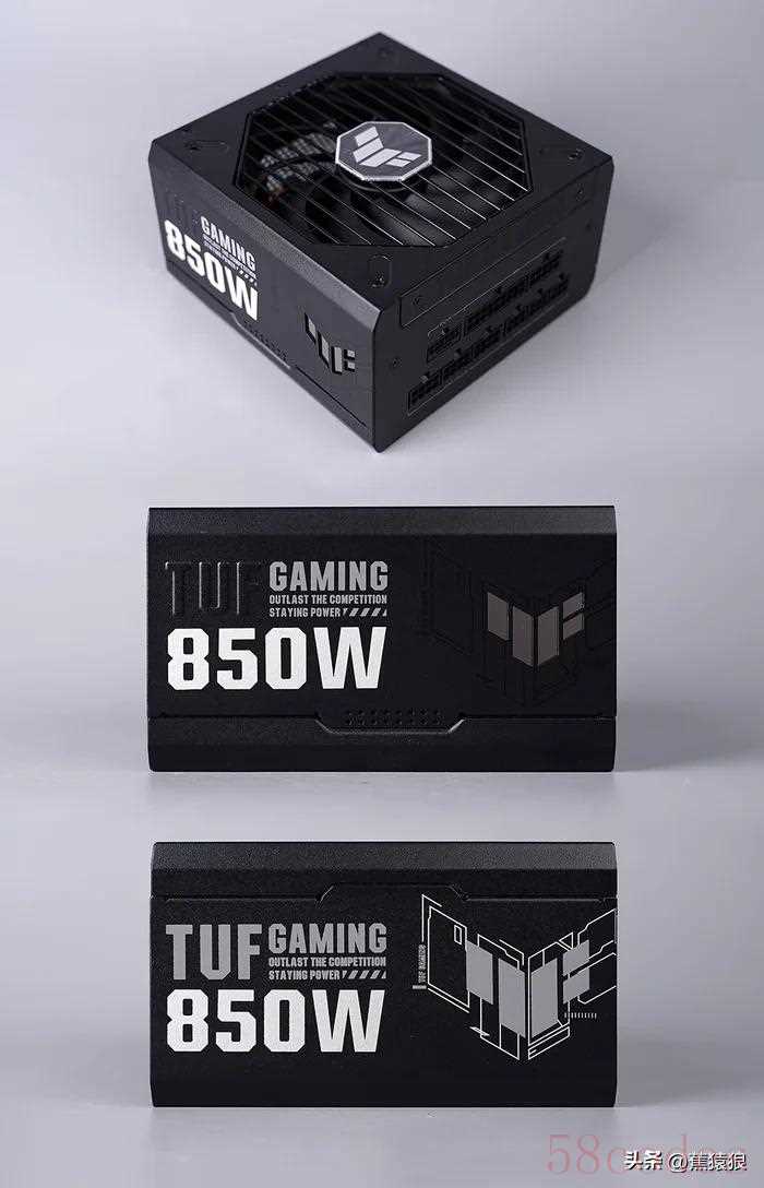 电源本体,采用标准 ATX 电源尺寸规格,具体 150×150×86mm ( L x W x H )。外观有别于常规电源,TUF GAMING 上下左右两边做均倒角处理,有着非常不一样的造型外观。机身两侧,品牌元素修饰,凸面 TUF GAMING ... 组合型号文字,一侧为 TUF LOGO 光亮处理。