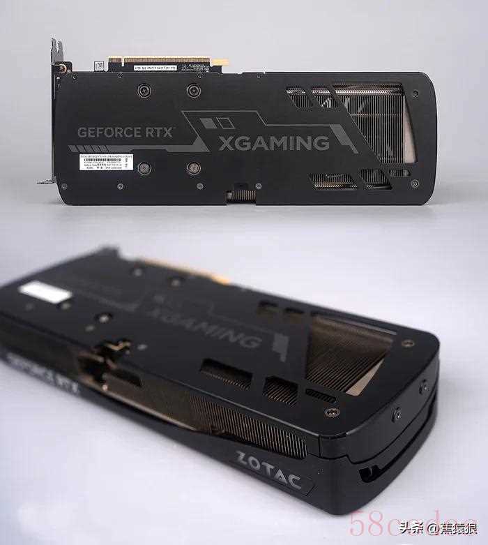 散热器的上盖与金属背板采用了包裹覆盖设计,使得外观显卡更具一体感,背板印有GEFORCE RTX & XGAMING 标识图案钻石。末端采用喜闻乐见的大面积的镂空设计,通过贯穿式的风流,强化显卡的散热效能。