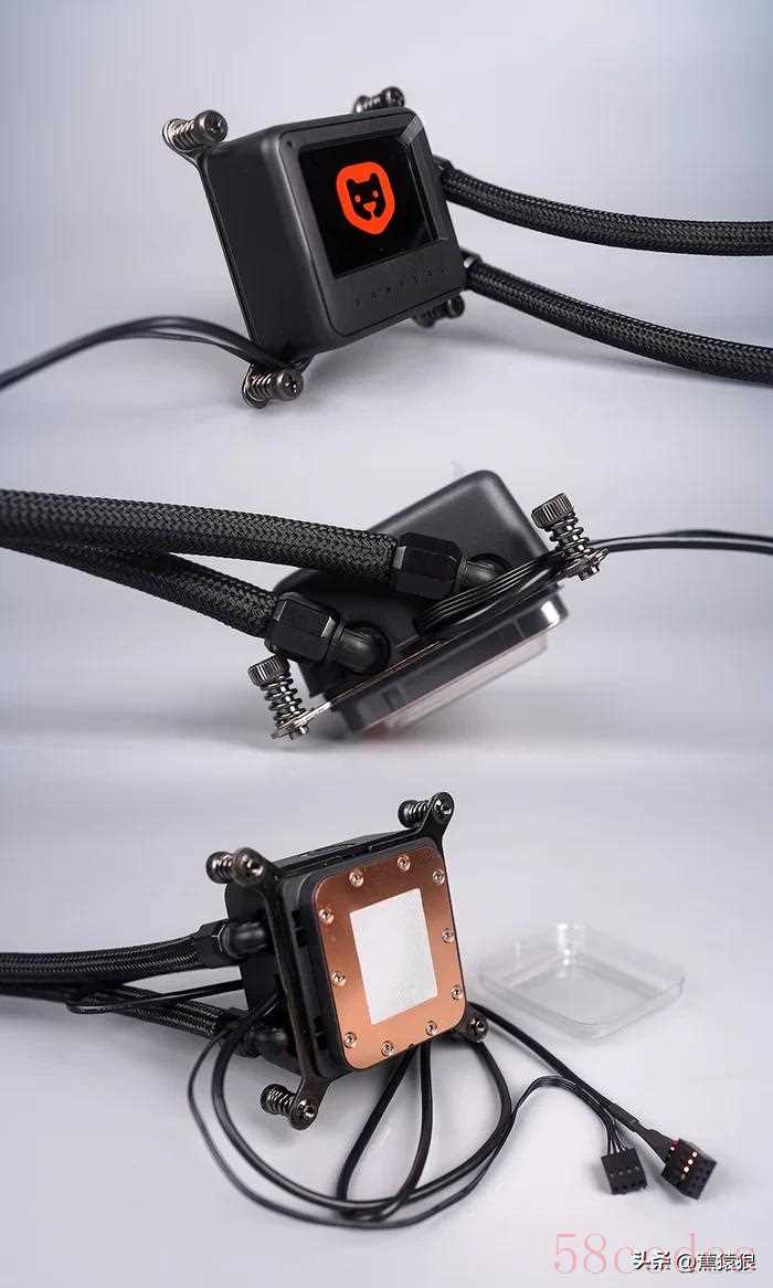 冷头采用方正造型,搭配屏幕尺寸为 2.4 寸 320×240 分辨率。通过 ASUS InfoHub 软件功能,能够展示实时系统信息,同时也可展示玩家的自定义内容。冷头接管附带金属加固,采用自由旋转设计,可以让玩家随心调整角度,实现贴合机箱的走管效果。采用大面铜底,出厂预涂了高性能硅脂,确保散热效能。