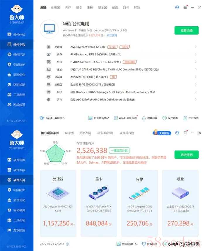 「 性能测试 」室温约为 28 度左右,BIOS 内存开启 EXPO,CPU 开启 PBO, WIN11 的系统,实际测试结果或多或少会有些许出入,仅供参考!鲁大师,具体的配置信息,给到的综合性能得分为 2526338。