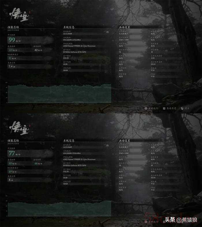 《 黑神话: 》2K 分辨率,超高画质与超高光线追踪,测试平均帧数:77FPS,超高画质关闭光线追踪,测试平均帧数:99FPS。