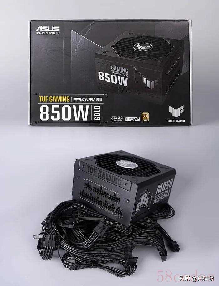选用华硕 TUF GAMING ATX 3.0 850W 金牌全模组电源。包装正面电源渲染图示意,标注采用 ATX 3.0 设计、具备 10 年的质保时间 、80 PLUS 金牌认证等。电源搭配黑色压纹包网模组线,质感相当的不错,材质相比普通模组线也来得更软一些,更好的走线,更加的美观,基本可以省去后做定制线的钱了。
