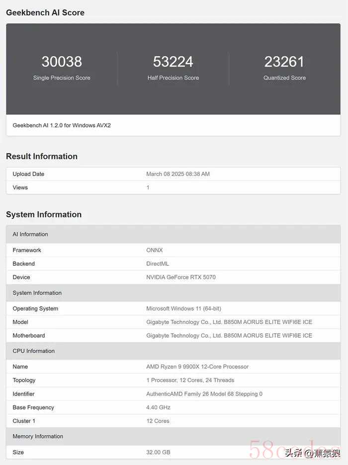 在 AI 性能方面,GEEKBENCH AI 测试,得分如图。