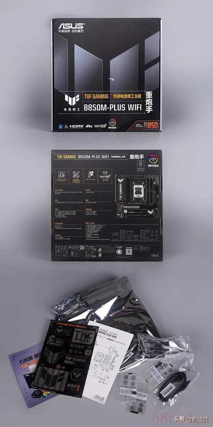 「配件介绍」主板选用的是华硕的 TUF GAMING B850M-PLUS WIFI 重炮手,包装延续 TUF 系列的风格设计。包装正面大大的 TUF 系列标志,搭配纯黑白设计,显得相当冷峻硬朗,包装背面图文展示具体的规格信息。相关附件包含有宣传卡片、说明书、贴纸、M.2 螺丝垫片、SATA 连接线、WIFI 天线。