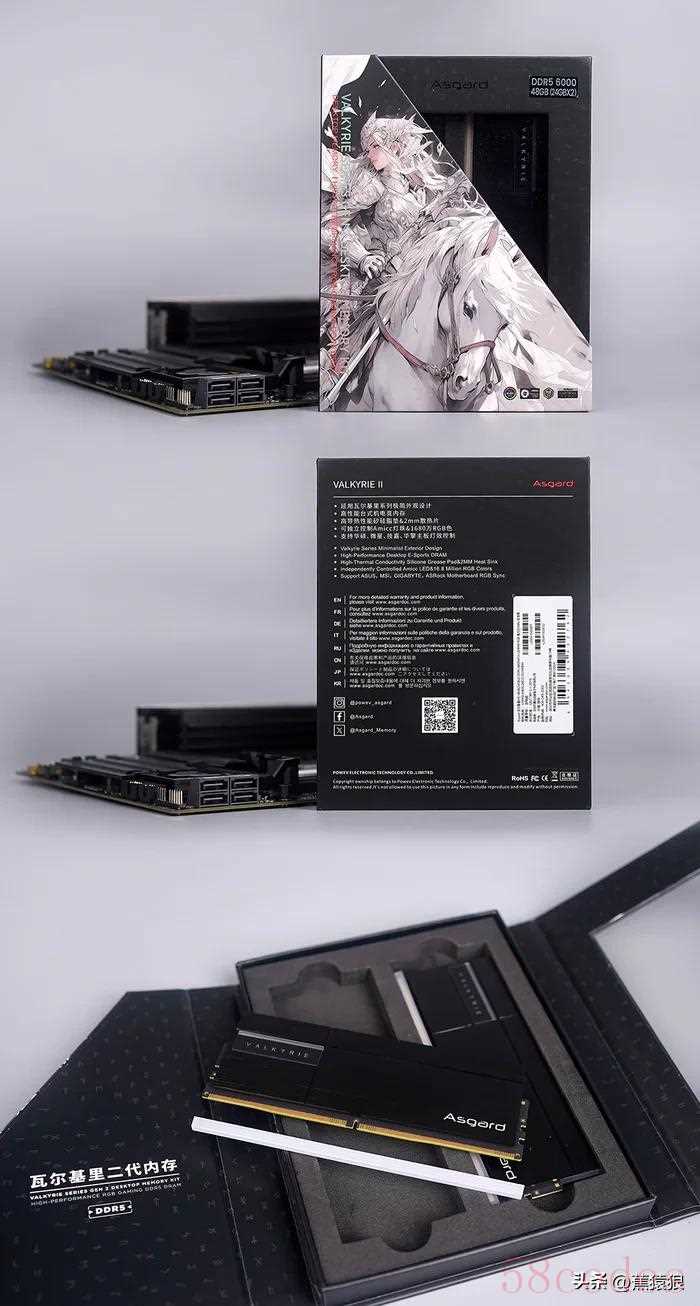 内存选用阿斯加特 Asgard 女武神二代白色款 6000Hz C28 24GB×2 套条。包装采用斜面双层设计,外层女武神的漫画装饰图案与型号,下沿同标注各大主板厂商灯效同步认证,内层透明开窗展示内存本体,一旁规格贴标。包装背面带有中英文介绍内存的设计的出处与特征,多国语言的保修说明,出厂贴标,示意型号等信息。里头内存采用黑色海绵包裹保护,内存出厂预装有金手指保护套。