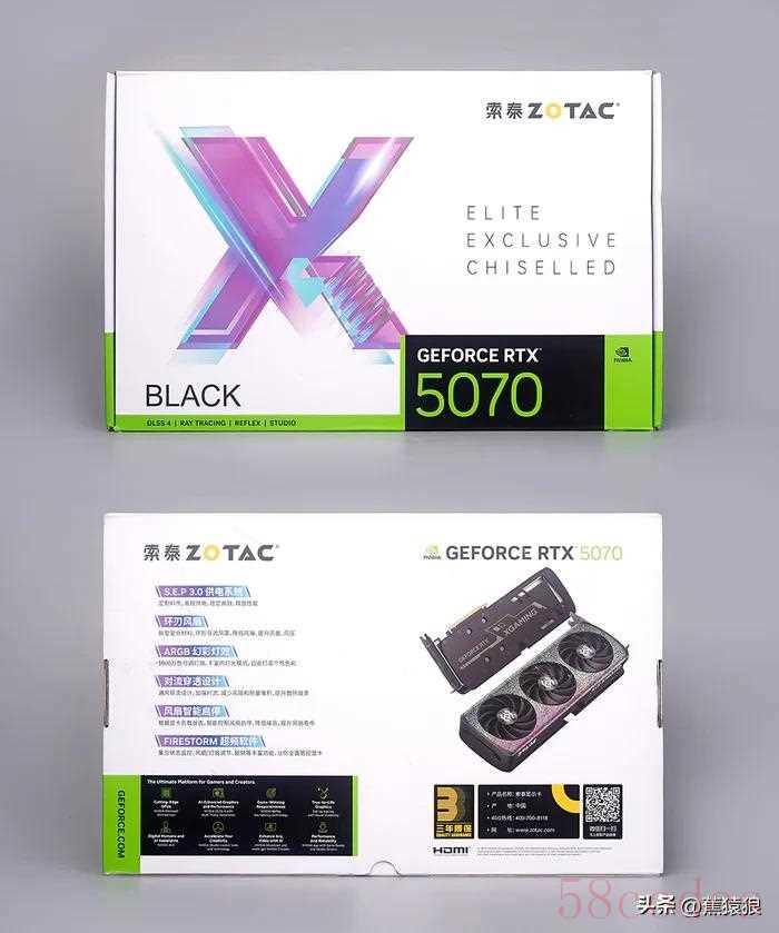 索泰 GEFORCE RTX 5070 12GB XGAMING OC BLACK,包装采用白色简约风格设计。正面以 X 字母图案做为装饰,包装背面配有显卡渲染图展示及卖点描述。