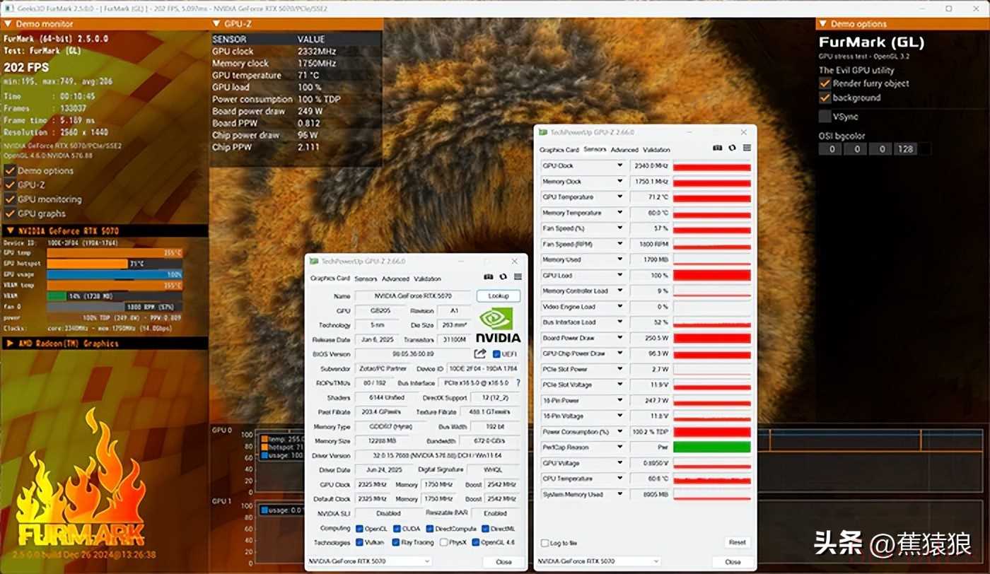 FURMARK 满载测试,过程 10 分钟左右,核心温度 71 度,显存 60 度,显示功耗 250W 左右。
