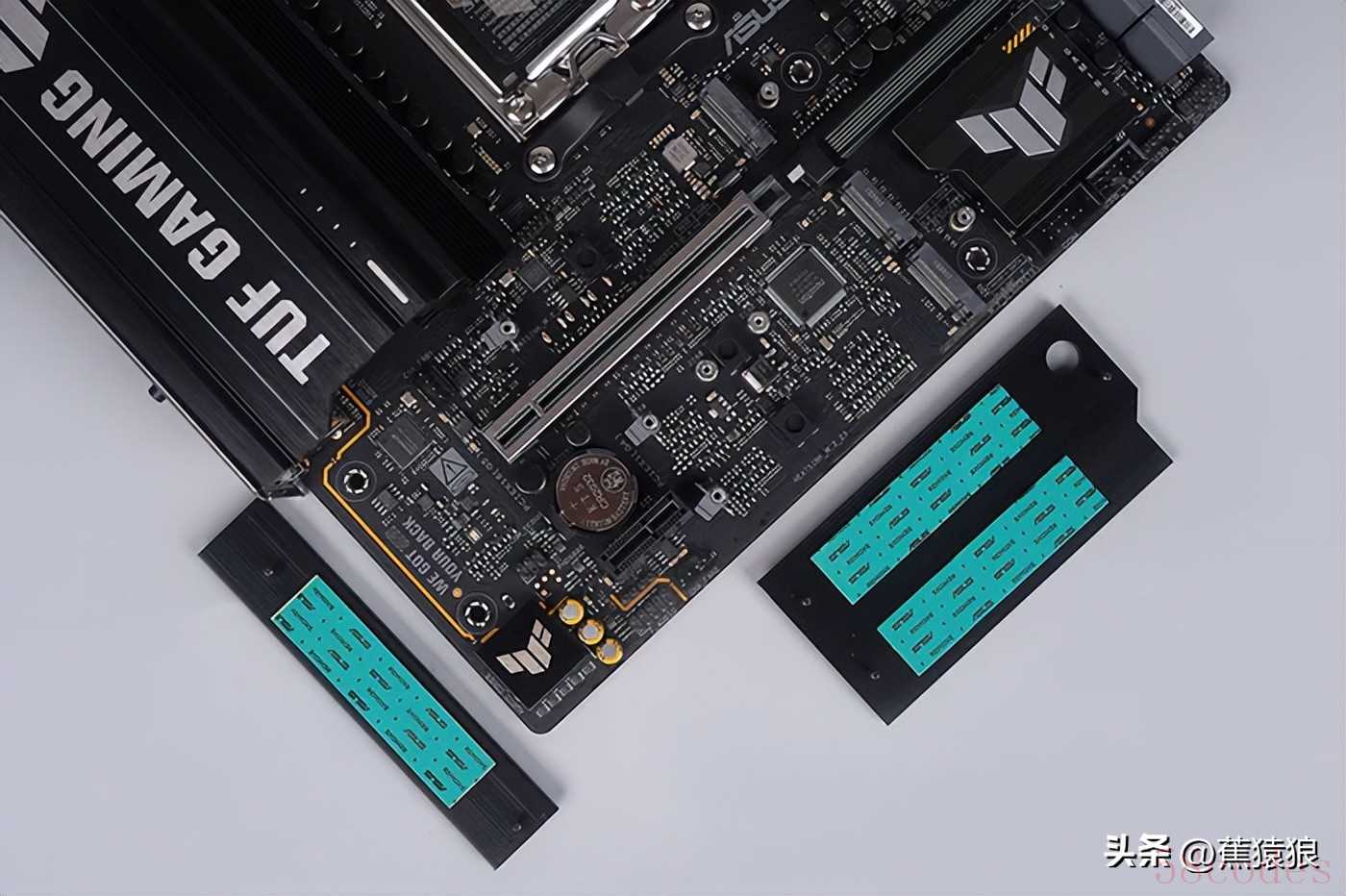 M.2 接口方面:最上面的插槽为直连 CPU 的 PCIe 5.0 M.2 插槽,下面还有两个 PCIe 4.0 M.2 插槽,则由芯片组提供支持。均覆盖有金属散热片,可确保 SSD 稳定传输不掉速,安装方式均为便捷的卡扣设计,无需任何工具即可轻松装卸 SSD 设备。