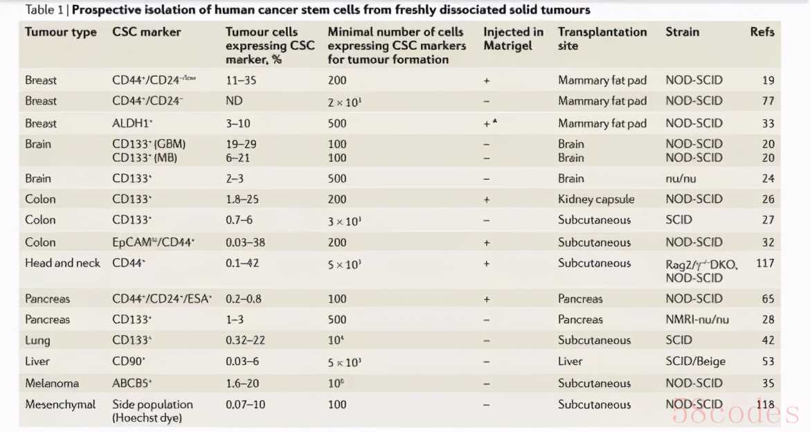 不同癌症类型的癌症干细胞标记物。数据来源:Nat Rev Cancer, 2008. 8(10): p. 755-68.