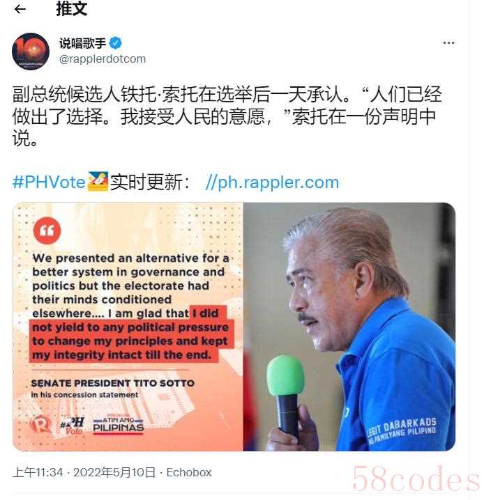 值得注意的是,副总统候选人,菲律宾参议院议长索托(Vicente Sotto III)在选举调查中始终位居第二。5月10日,他承认了领跑者达萨拉·杜特尔特副总统之位。