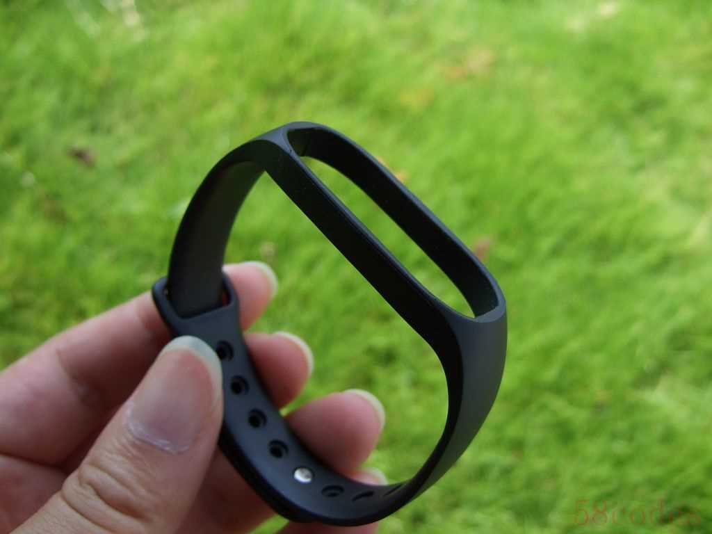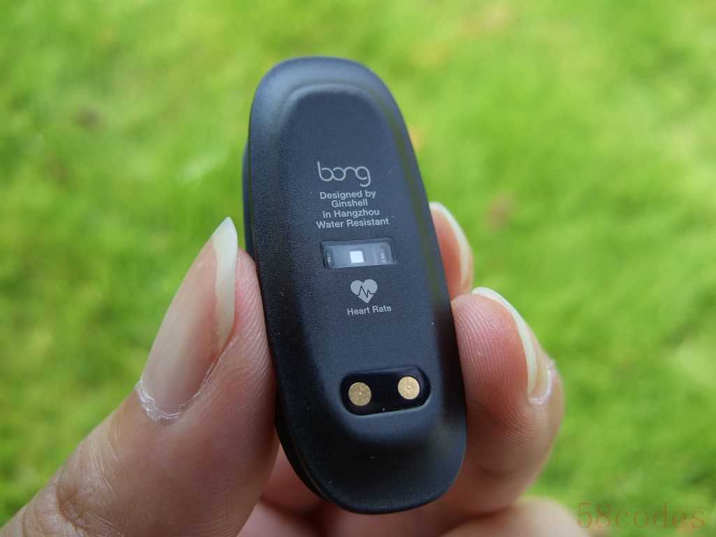▲手环主机底部有着轻微的弧度,可以更好的贴合手腕,心率检测器位于正中间,那块透明玻璃里面就是检测器,下面的2个金属触点用于充电。