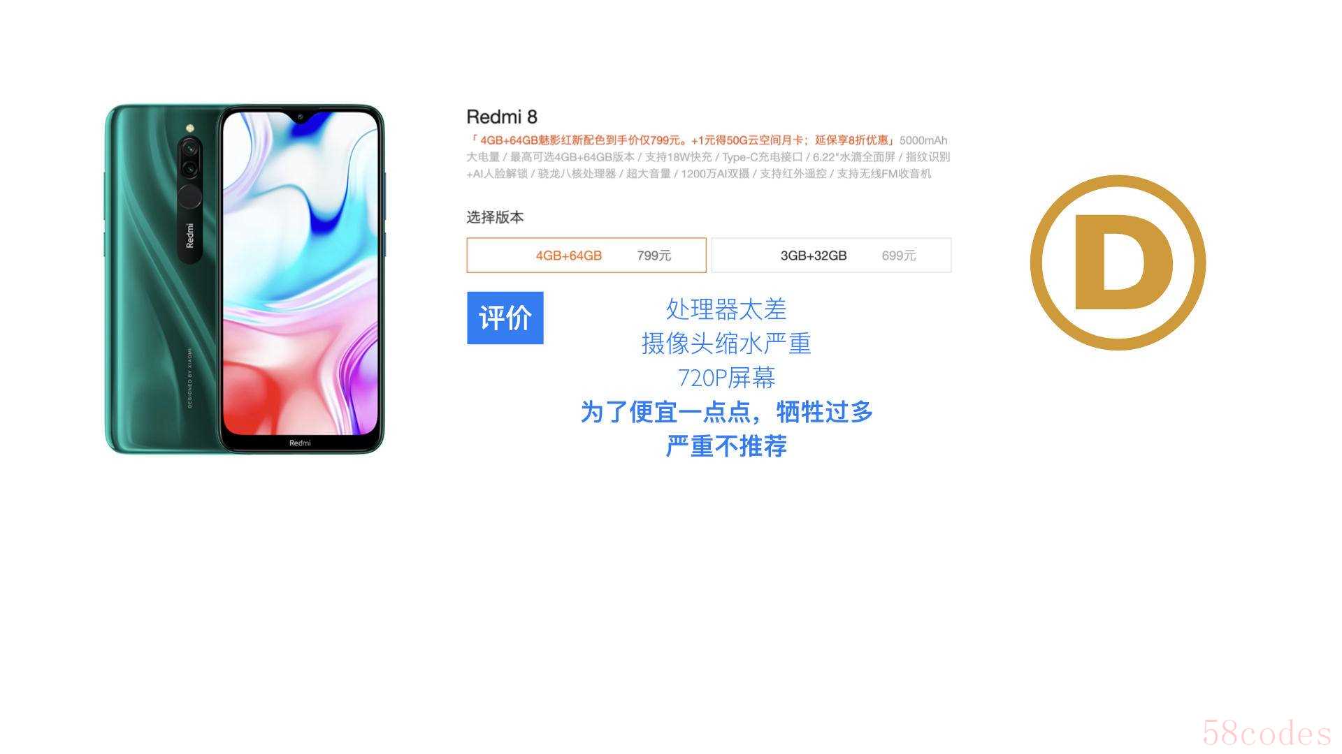 红米的数字系列,完全就是为了迎合部分人超低价的需求,价格便宜了两三百,但是简配简到了完全让人无法接受,比如高通4系列的处理器,比如仅仅3+32G的存储,屏幕分辨率甚至只有720P,相机规格也大幅度缩水,因此,这个系列目前完全不推荐。Redmi 8,Redmi 8A,Redmi7A,都是D评级。