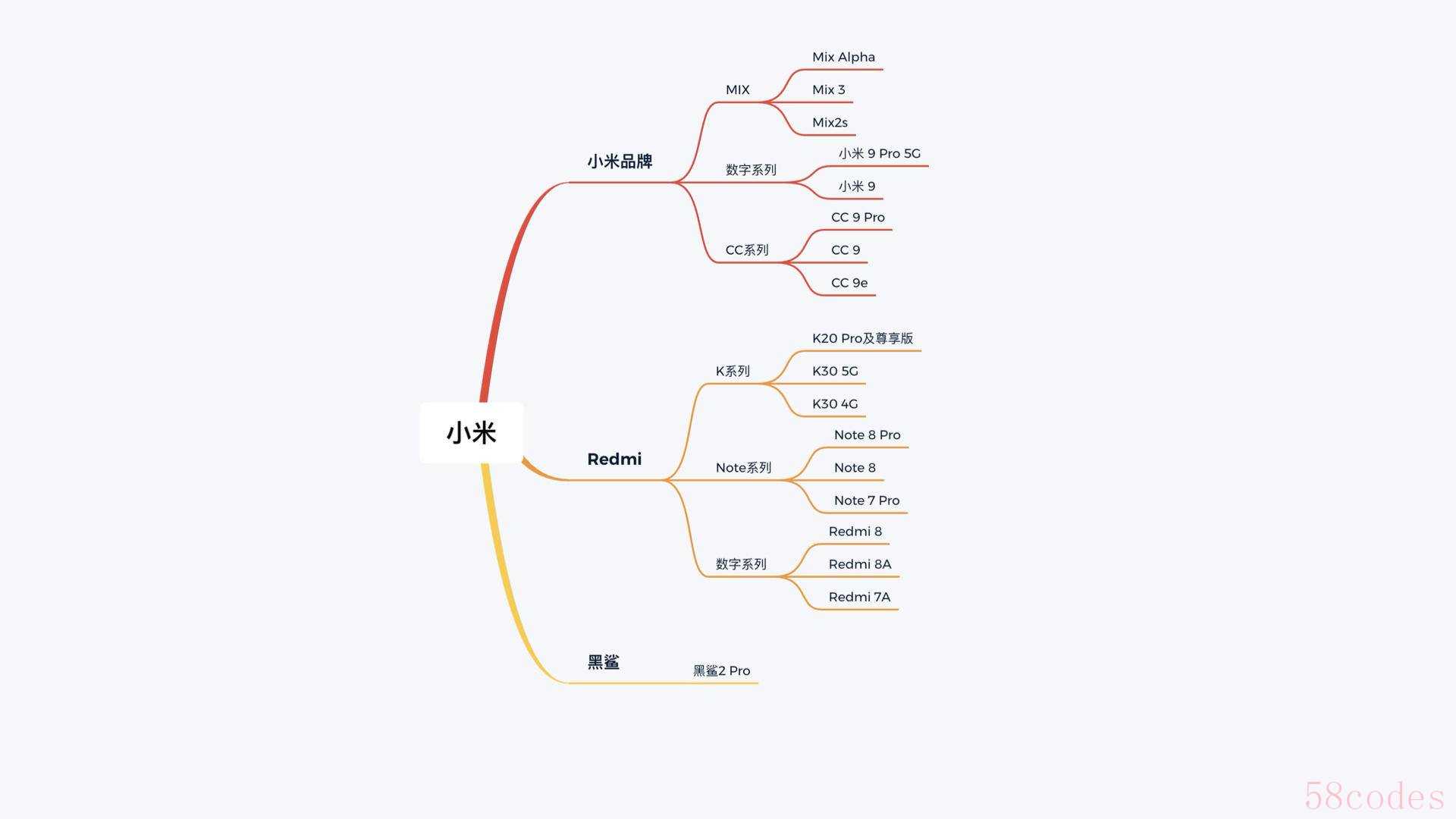 正如我们刚才所说的,产品线分为小米和Redmi两个分支,另外还有一个主打游戏的黑鲨手机,其中小米系列,从高到低依次有MIX系列,数字系列,CC系列。而Redmi从高到低依次有K系列,Note系列,数字系列,现有的机型如下