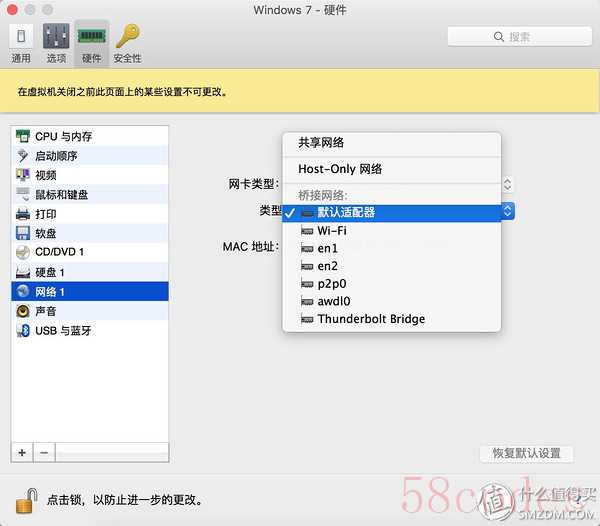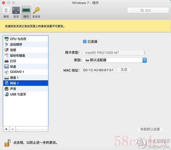 桥接网络则可以将虚拟机提升到与宿主机等同的位置,拥有独立的IP地址,可以像一台独立接入网络的设别与其他资源连接,缺点是有时候断网重连后需要等好一会才能连接上,还有时会影响OSX的连接,需要重启虚拟机才恢复正常