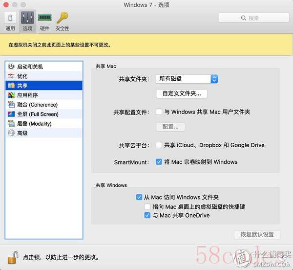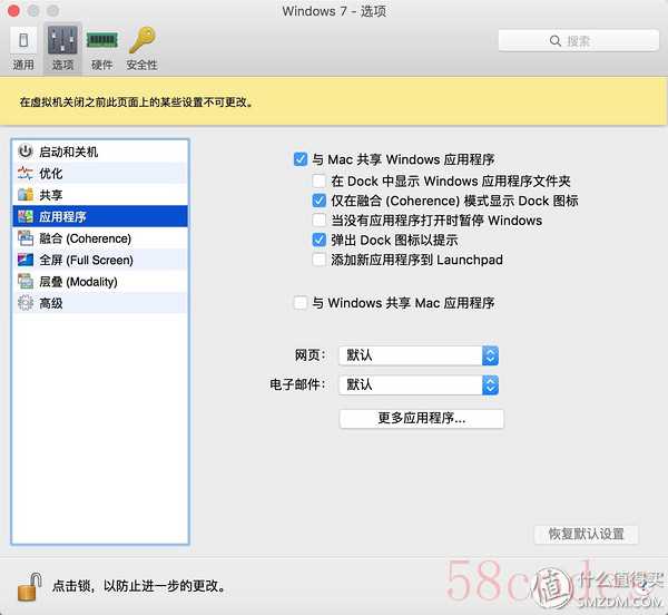应用程序页签调节程序共享的一些功能,尤其是“添加新应用程序到launchpad”这个,一定要去掉,否则虚拟机安装的程序多,会把launchpad填的满满的,难受得要死