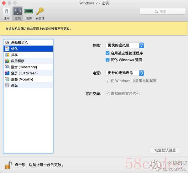 优化页签内用来调节虚拟机的性能分配策略,如果你感觉虚拟机慢或者卡,可以调整一下这里的选项试试