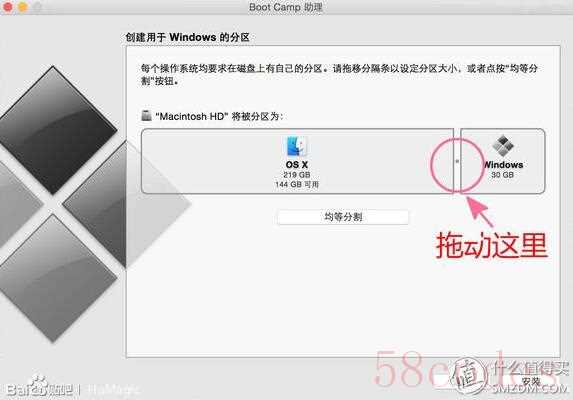 然后到了选择分区的步骤,拖动中间的分隔线,调整2个系统分配的空间大小,win7系统安装完大约15G,win10差不多有20G了,根据自己的实际应用选择就行