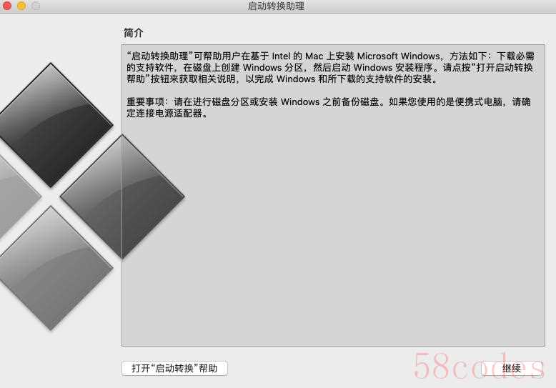 2、打开【启动转换助理】后点左下角的【打开“启动转换”帮助】