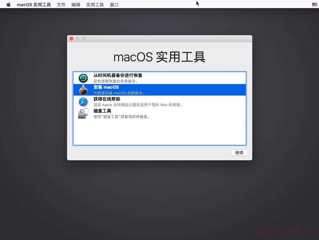 3、从【实用工具】窗口中选择【安装macOS】,然后点【继续】。