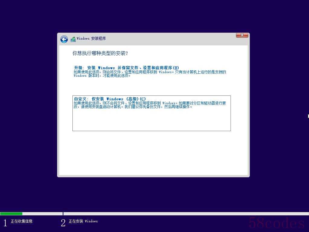 11、选择安装安装的类型为【自定义:仅安装Windows(高级)(C)】。