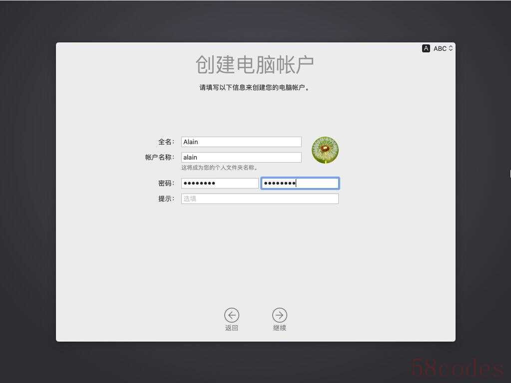 13、创建电脑帐户,输入用户名和密码,然后点【继续】。