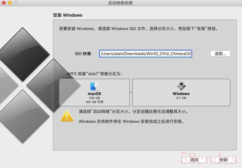 4、在【启动转换助理】界面中选择【选取】浏览下载的Windows映像文件,并调整MacOS和Windows系统磁盘分区的大小,然后点【安装】。