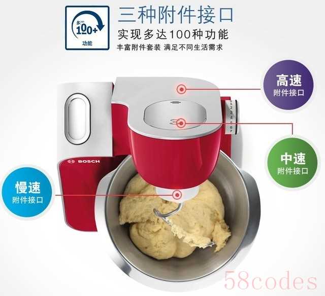 厨师机搭载尖端智能传感,实现恒速揉面。用户可根据自己的需求自由选配各种附件,可用于制备各种食物,如冰沙、奶昔、鸡尾酒、蛋黄酱、蔬菜土豆泥等婴儿食物,制备浓汤、碎冰、碎各种食材,以及制备酱汁,制作面点、甜点等,真正实现一机多用。