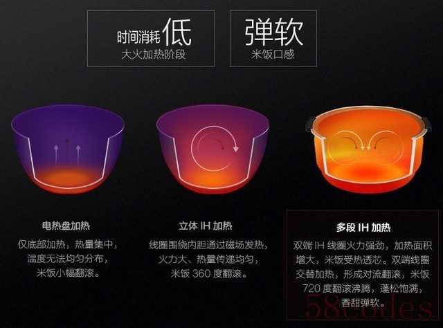其中可变压力范围0-25Pa,步进电机配合微压钢球双重调节。一方面高压高温使米粒充分糊化,析出香糯口感,另一方面压力的骤变可以促进沸腾翻滚,米粒蓬松;多段IH加热,火力交替受热高效均匀,并且可以促进米粒一步对流翻滚。