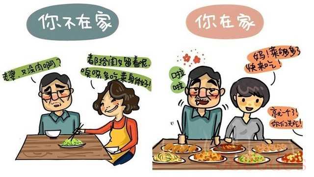 在家我们可能经常会发生如下情景:我们不在家时,父母可能就随便吃点,一切从简,爸爸总是抱怨没肉吃,一日三餐,清粥小菜;但是当我们回到家的时候,妈妈总是会准备一桌子丰盛的菜肴,爸爸终于可以开荤了!