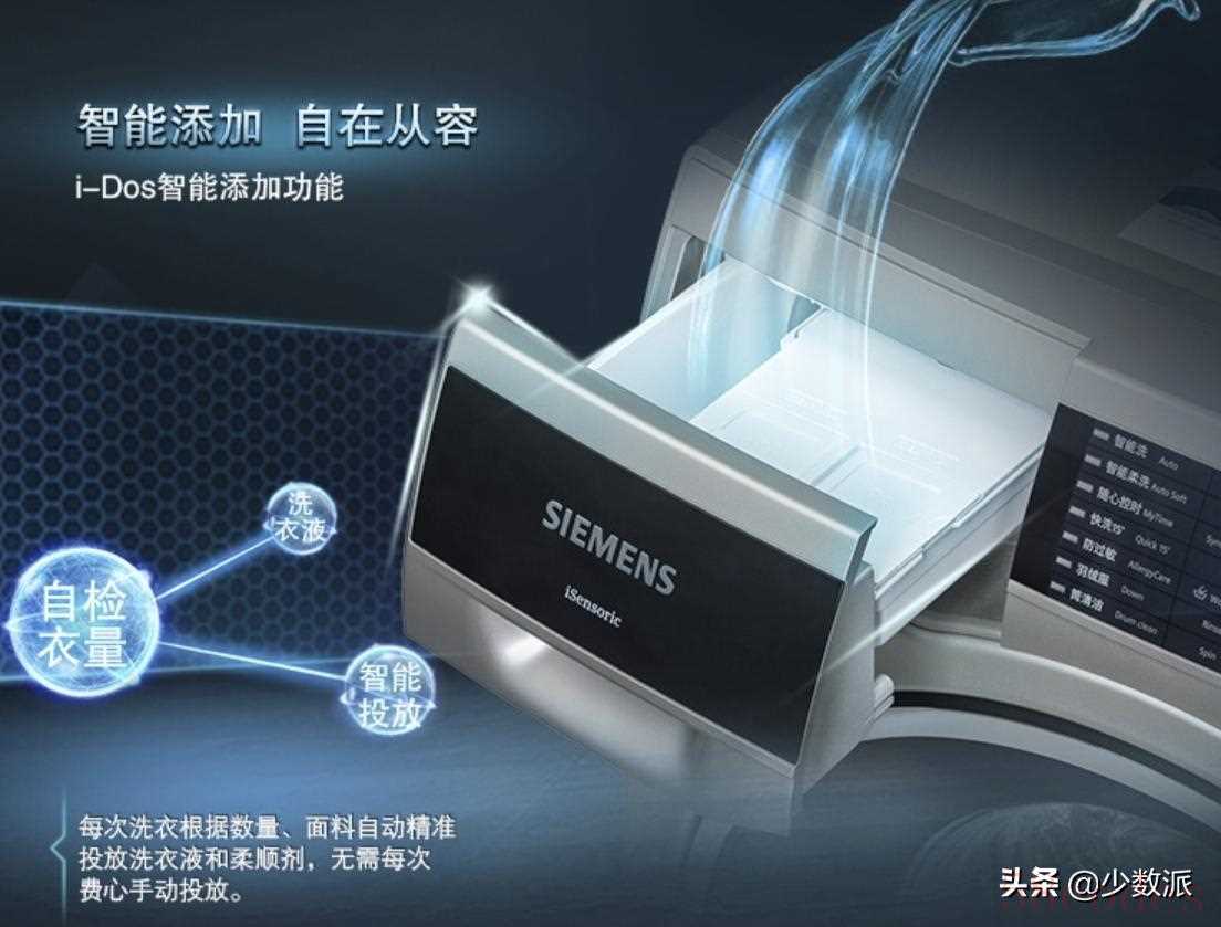 因此,挑选新家洗衣机的时候,我就希望洗衣机能自己确认需要洗涤剂和柔顺剂的用量,最后选定了这台带有 i-Dos 2.0 智能加液的 iQ500。智能加液顾名思义,就是能根据具体的衣物的多少,在充分洗涤柔顺的基础上更精准得添加洗衣液和柔顺剂,即减少了洗涤剂和柔顺剂的浪费,也减少了水资源的浪费保护了环境。 2.0 版本相比原先只能用在智能洗这一个程序上,主要体现在智能加液程序可以用在大部分的程序上,显得更加灵活自由。最后,智能加液也解放我,不用每天都要手动加洗衣液和柔顺剂,只需要每个月定期抽空加一次就好,方便又省力。智能化洗涤远不止智能加液,洗衣机也可以更精准的控制水位,不仅洗的干净还能更好得节约用水;针对不同的衣物设计不同的洗涤程序,调整滚筒的运作方式,减少衣服的磨损;还会通过智能感知告诉你什么时候应该使用桶清洁程序,让你洗衣的时候更健康。至于更贵的洗衣机,比如美诺 Miele,除了上述特点以外,你甚至还可以使用不同的洗涤胶囊,对特殊衣物进行更充分的护理,更进一步得发挥洗衣机的智慧洗涤的功能。
