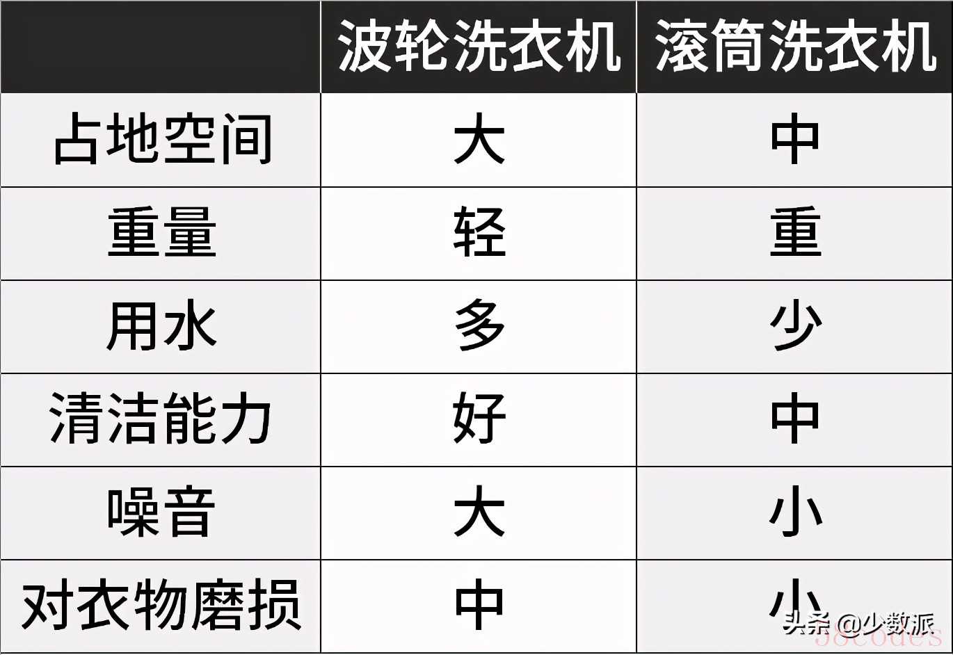 滚筒洗衣机和波轮洗衣机最主要的区别就是洗衣方式的不同。滚筒洗衣机通过滚筒产生巨大的离心力,停止以后衣服混合着洗涤剂和水从高处跌落到底部,很像是以前洗衣服时用棒槌敲打衣服,最后达到去渍的效果,同时为了更好的去污效果滚筒洗衣机还可以选择较高的水温。而波轮洗衣机通过底部波轮的转动让水流跟着转动,衣服混合着洗涤剂和水依靠着彼此之间的摩擦力达到去渍的效果。根本上洗衣原理的不同才导致了这两种洗衣机在占地空间、重量、噪音、用水、清洁能力和磨损上有很大的不同。