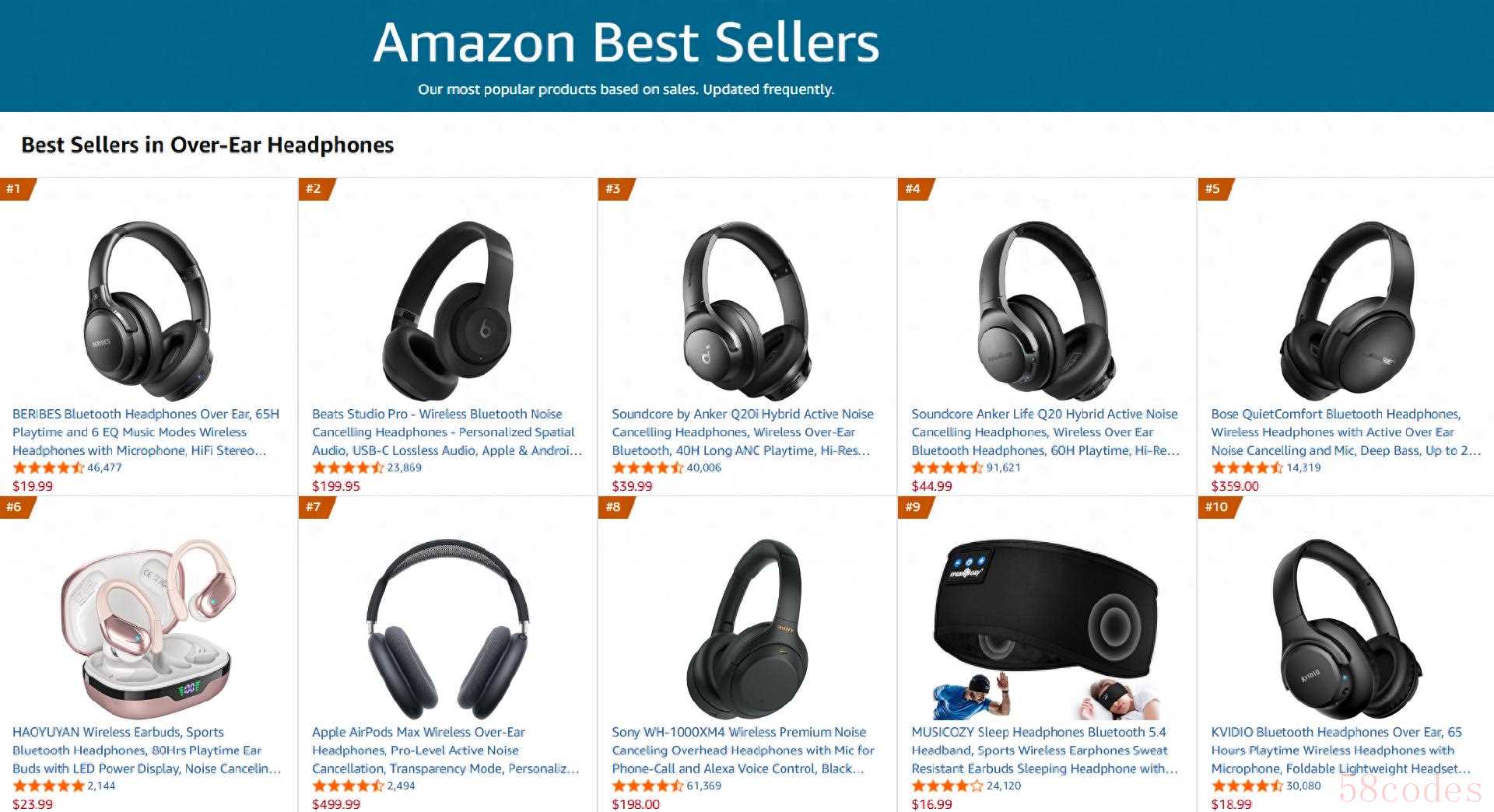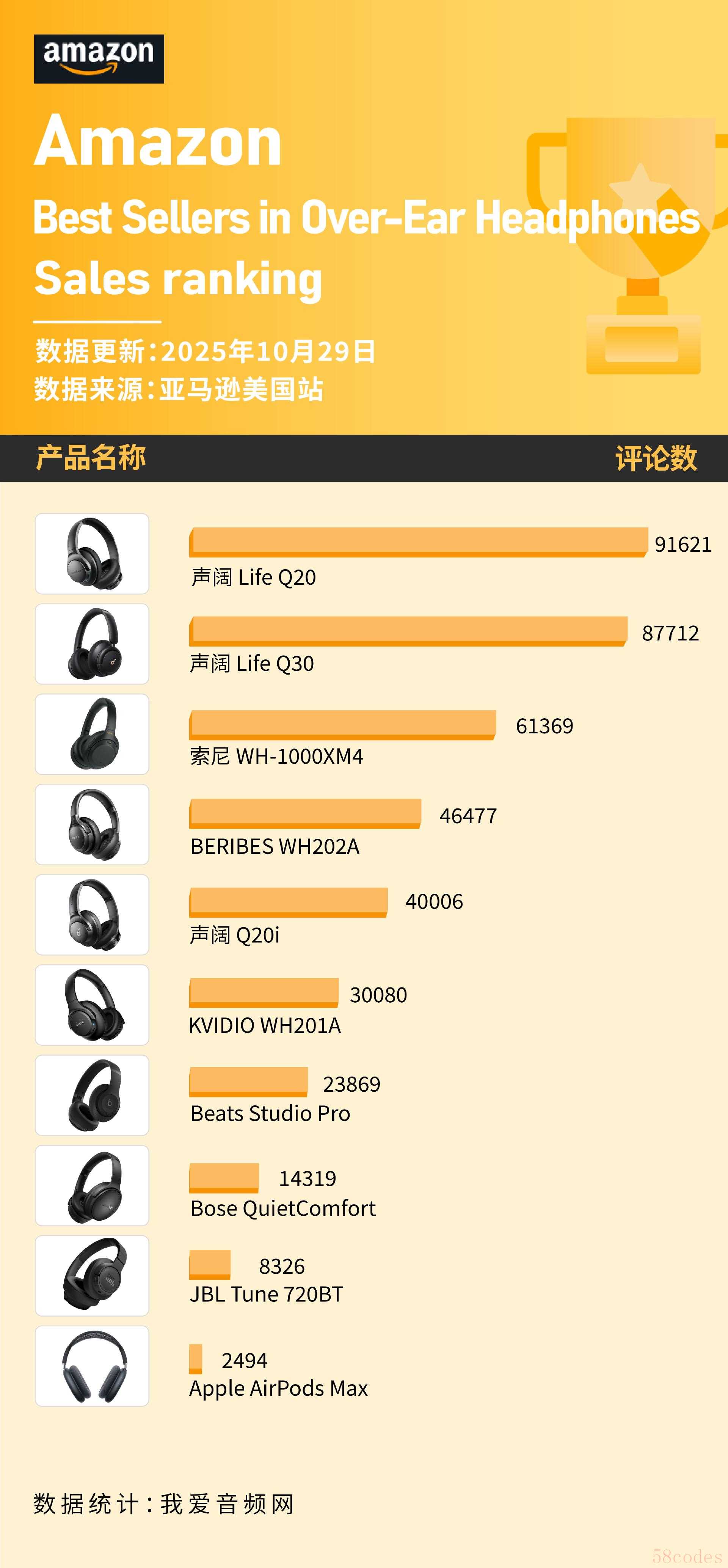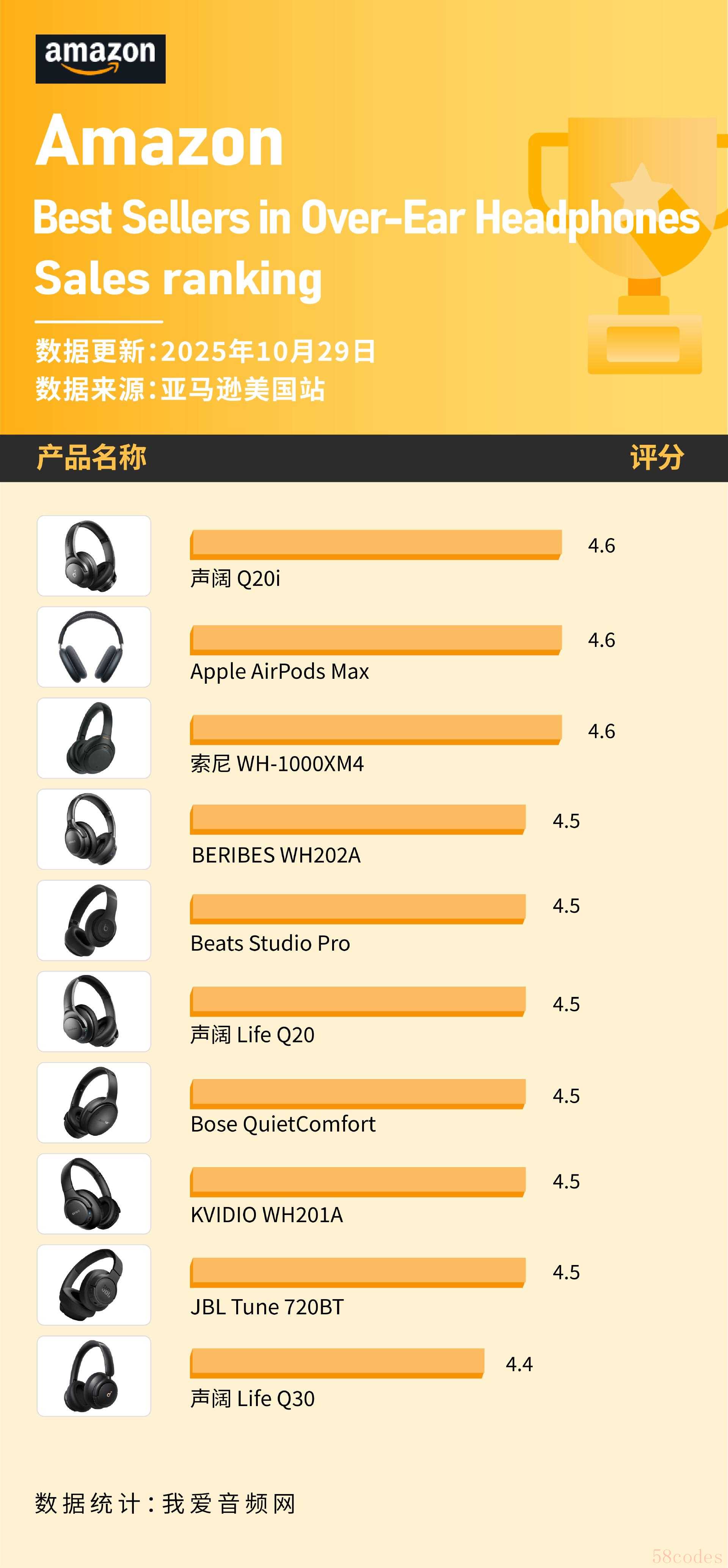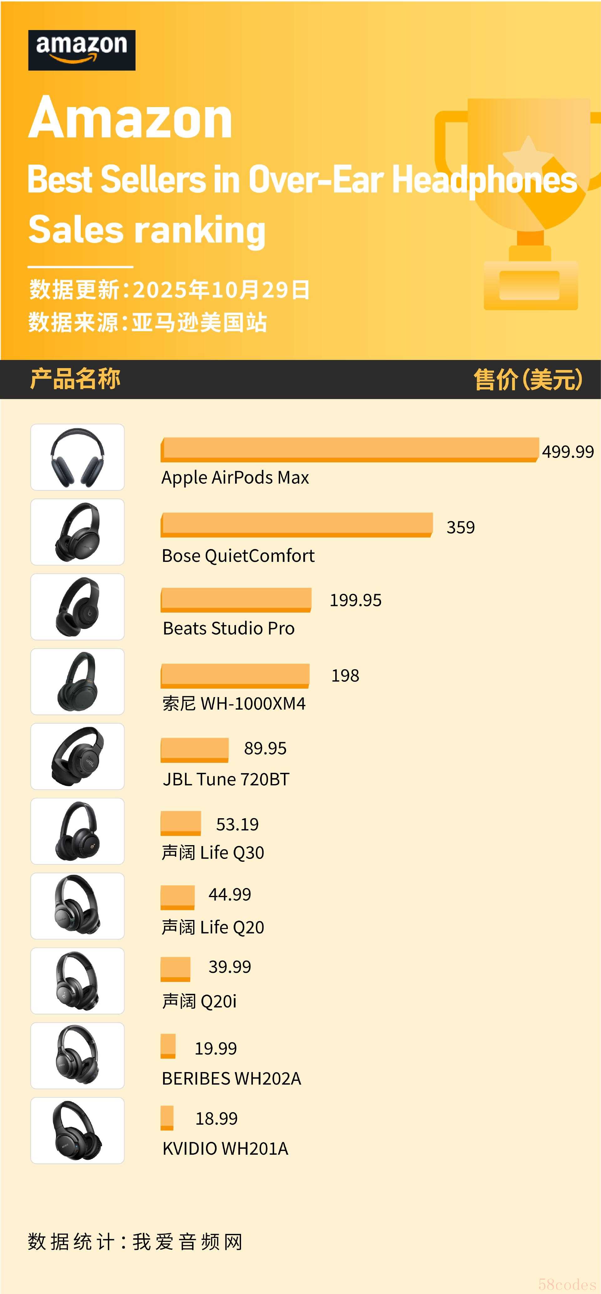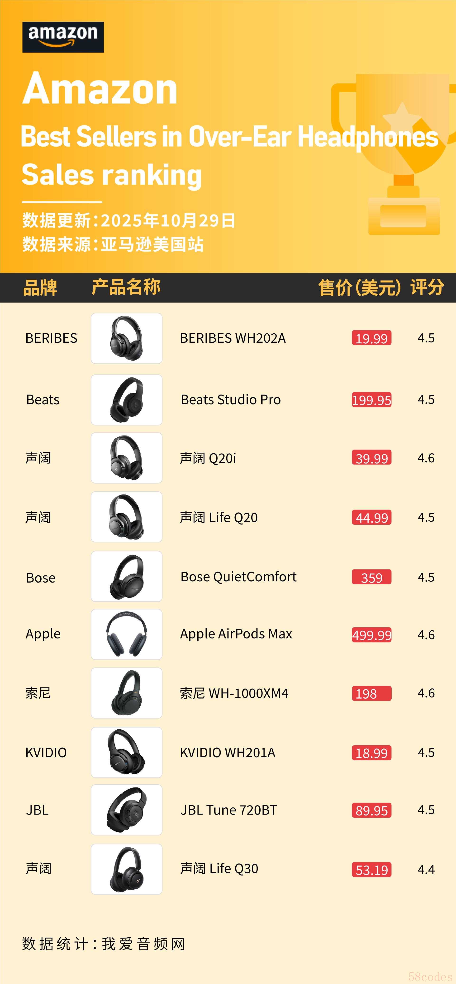 我爱音频网将从产品售价、产品口碑、产品互动量三个角度入手,去分析上榜耳机的产品特性与优势,以便更好地了解市场动态。以下数据截止至2025年10月29日,美国亚马逊"Over-Ear Headphones"分类销售排行榜前十的耳机(仅统计头戴式耳机)。产品价格、评分、互动量均以统计时的数据为准。