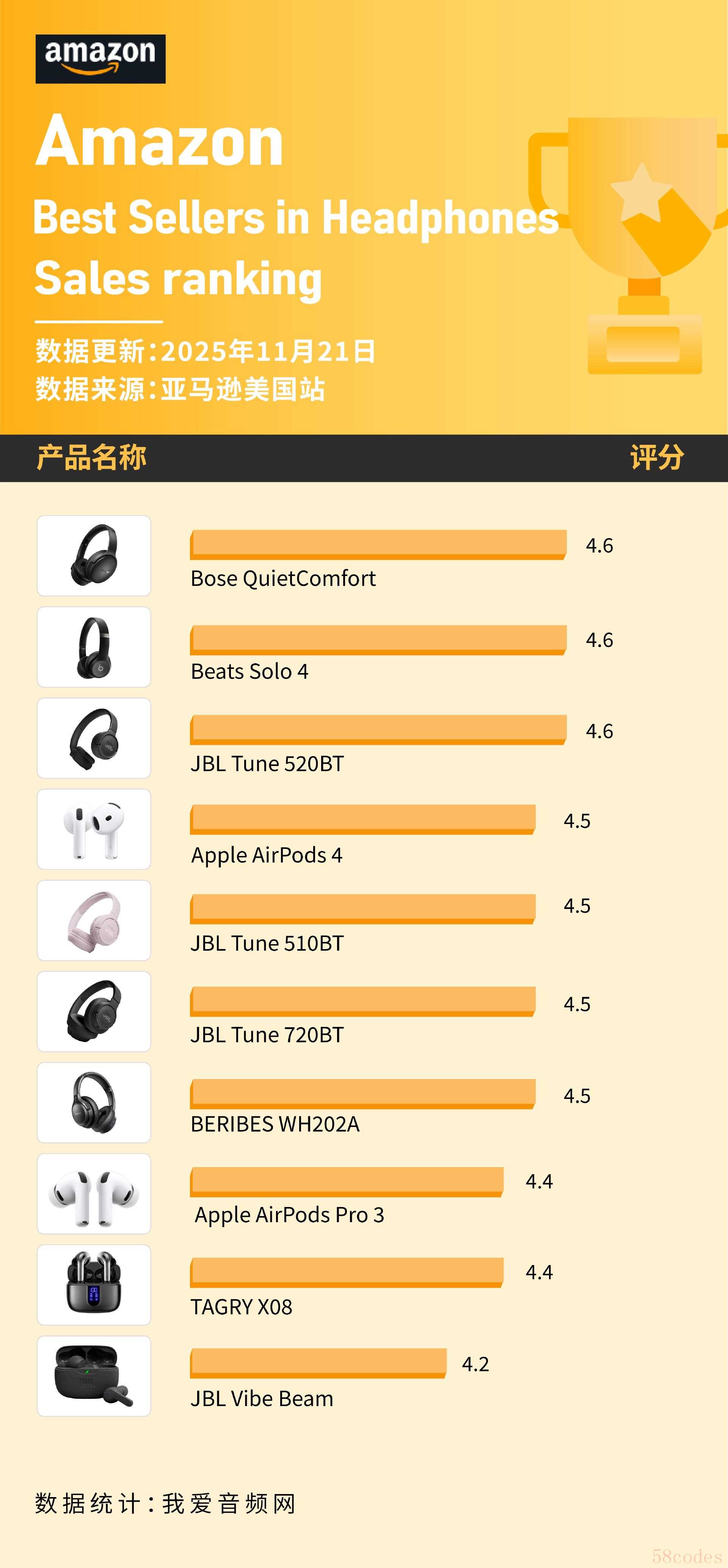 美国亚马逊2025年11月蓝牙耳机评分榜