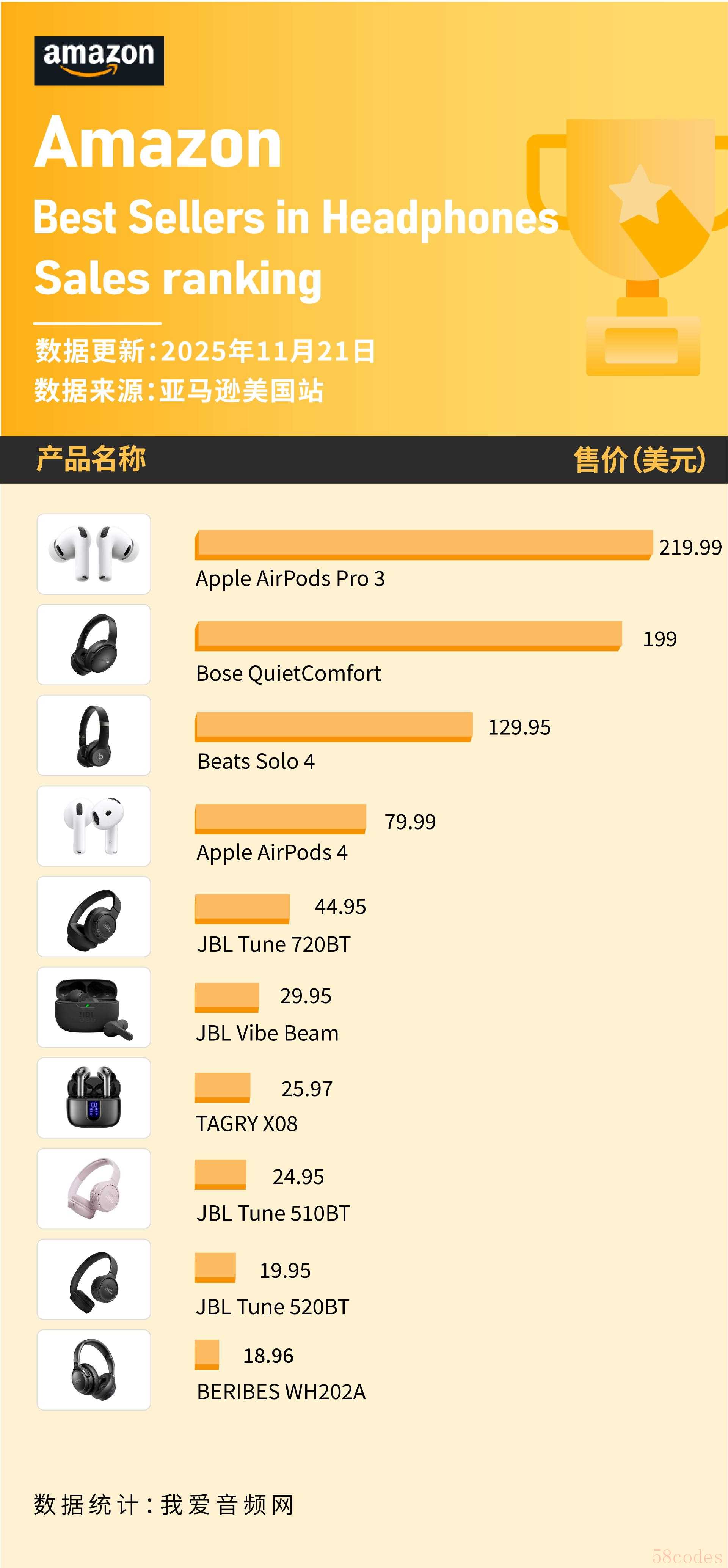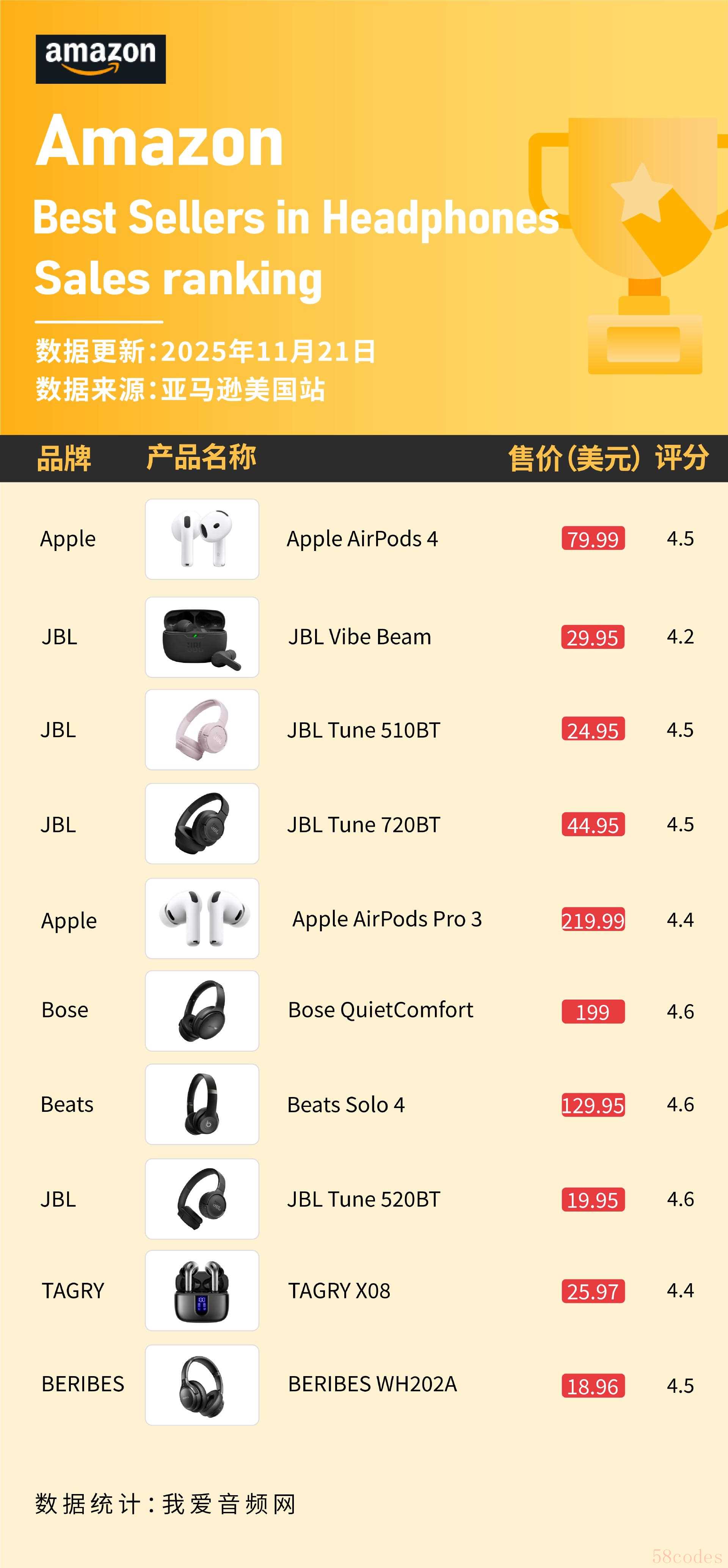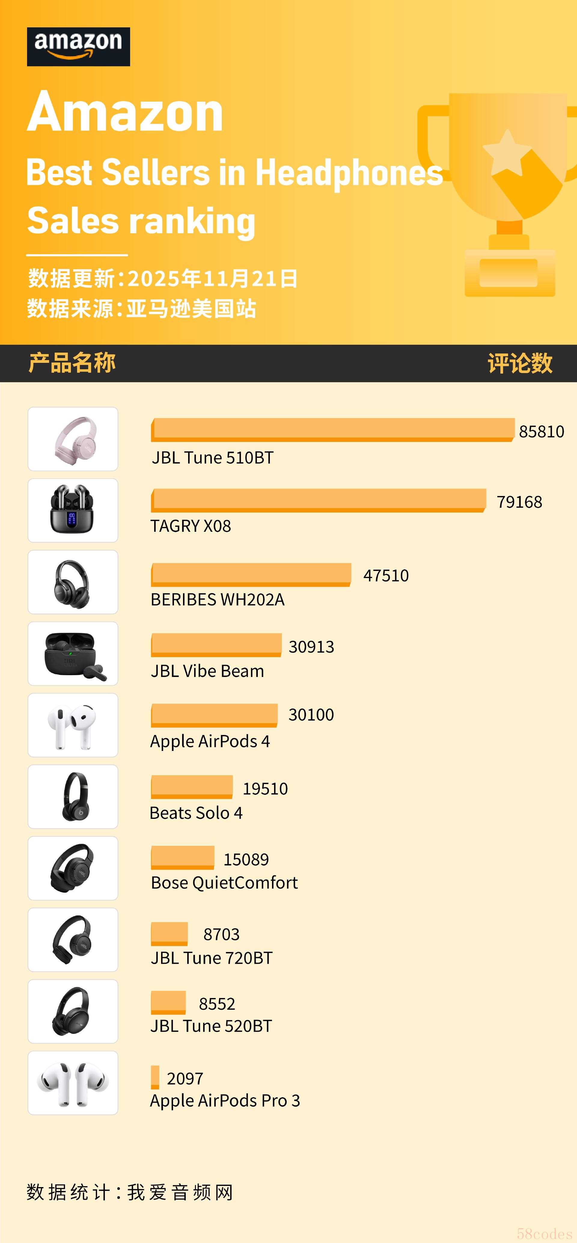 以上为我爱音频网整理的美国亚马逊2025年11月蓝牙耳机的销售分析。JBL在这个月表现突出,有4款产品上榜。包揽榜二到榜四的位置,有头戴式耳机和真无线耳机两种类型。