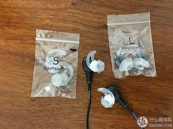 M号的耳塞已经装好在耳机上,另外两副替换耳塞放在了收纳包里面。细节很用心,包装袋上面有标注尺码。S号底部是白色的,我已经替换到耳机上;M号是出厂时已装配的耳塞,底部是灰色的,已装进S号的收纳袋;L号的底部是黑色的,不同尺码通过颜色也很好区分。耳塞替换很方便,材质非常柔软,佩带舒适,卡住会有“咔”的一声,装好后很牢固。耳塞整体做工和细节都值得赞一下