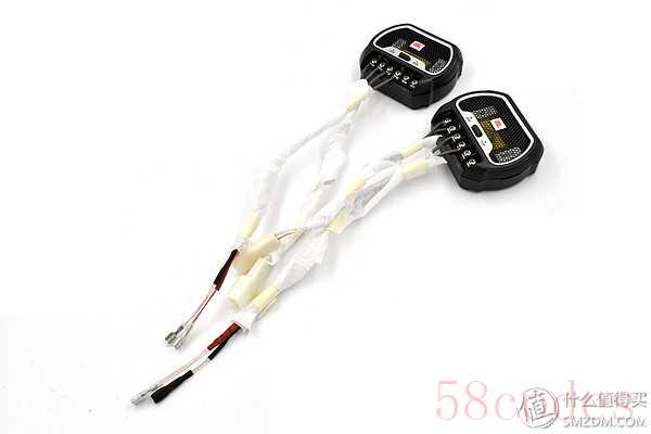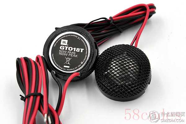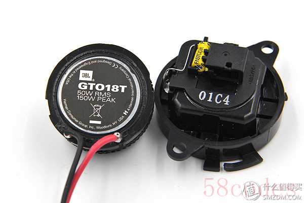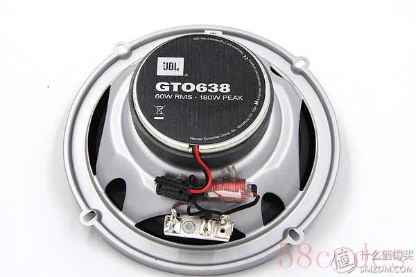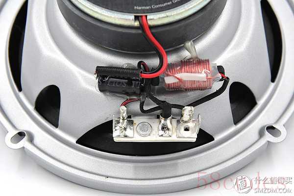 原车背面有个分频用的电容。为什么原车有电容,GTO18T却没有呢?因为原车高音和中低音是并联在一条线上的,信号完全相同,高音信号接入高音喇叭前用的是这颗电容作为高频信号的分频。而GTO 608c套装中有分频器,信号先在分频器中分为高音和中低音两路信号分别输出,自然不要分频电容。