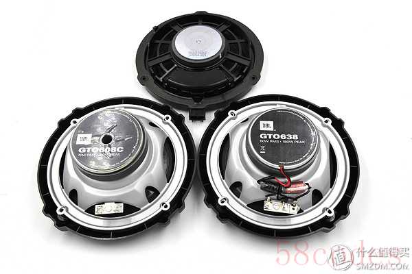 原车和JBL的高音喇叭对比。JBL的振膜明显有着金属质感,而原厂的振膜则为一般塑料材质。