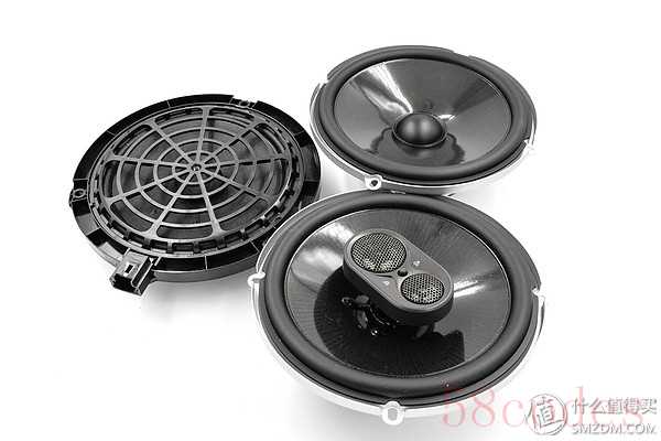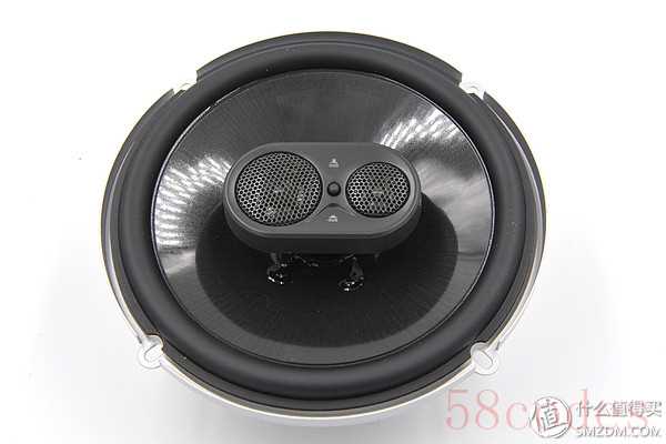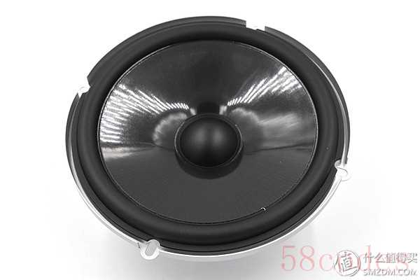 这是一款同轴喇叭,即所有高中低音集成在同一个圆盆内。与一般扬声器不同的是,638中间不是个球形,而是大小两个造型奇葩的小扬声器。查阅资料得知,这分别是1寸的钛膜高频喇叭和0.75寸超高频喇叭。也就是说,如果在后门安装这个喇叭,千万不要再另外增加一个高频喇叭了。
