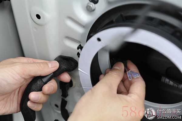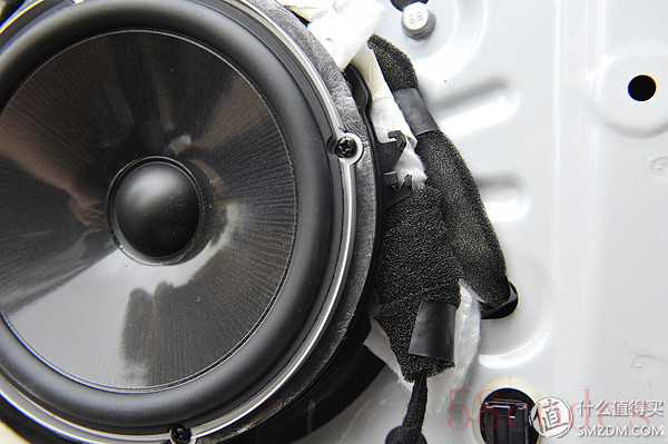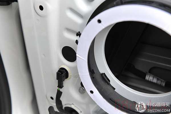 从上图也能看出,扬声器的线头是接在背面的,那么线怎么穿过去呢?po主在前门位置找到了一个洞,原本是用黑色贴纸贴上的,正好可以穿过线头。主要做好包裹防振。po主用的是装机用的防尘海绵包的,效果满意。