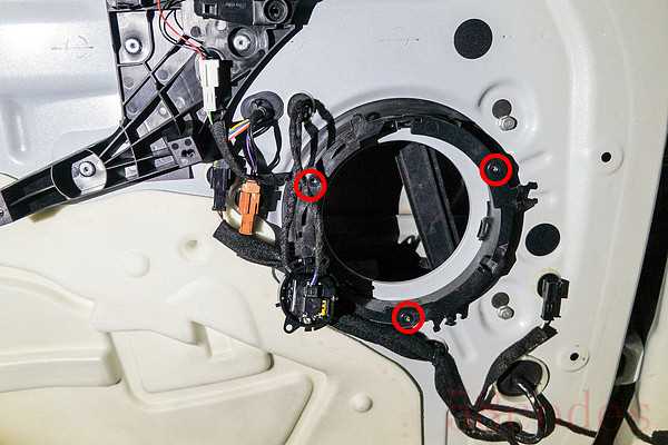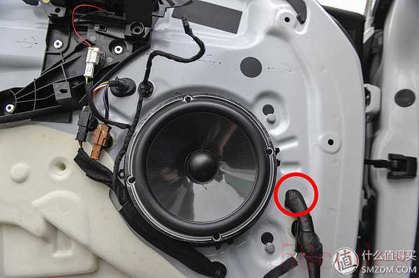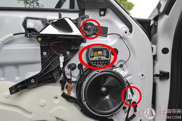 前门位置除了扬声器,还有一个高音喇叭和分频器。如图位置用3M胶带粘好即可。注意好图中红圈位置的隔音止振。