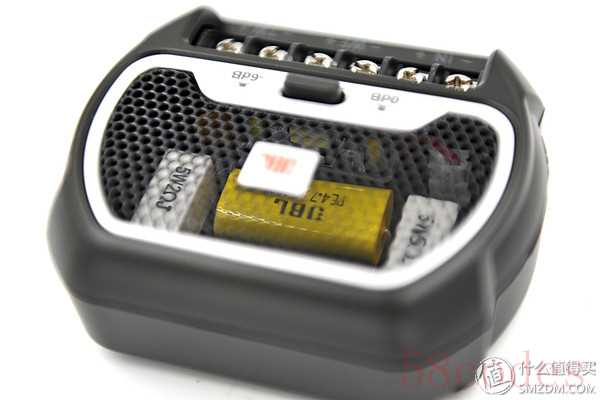 从背面可以看到,这款扬声器是标准的电源接口,在上方还集成有两个分频用的电感。