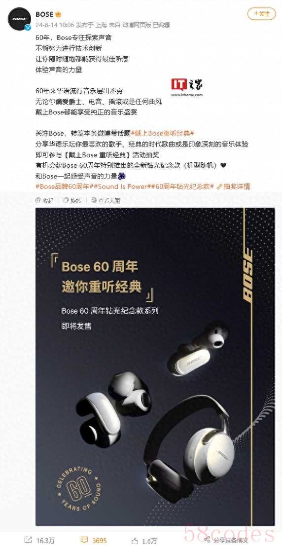 IT之家查询 Bose 中国官方微博,Bose 已经预告了 60 周年活动,暂未公布发售细节。