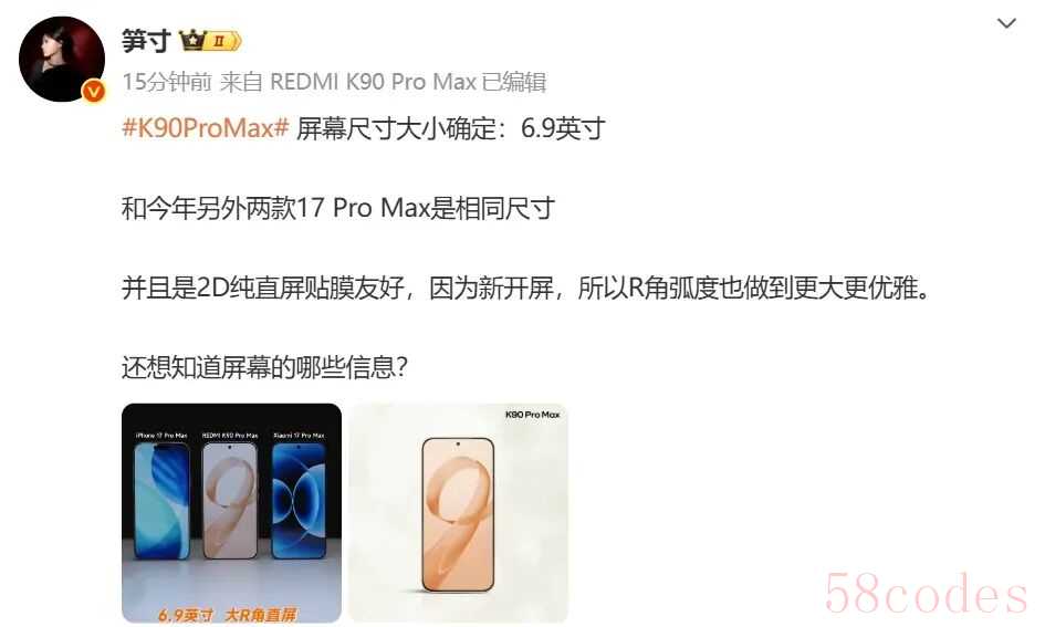 日前,REDMI 产品经理@笋寸发文透露,新机屏幕尺寸大小确定:6.9英寸,和今年另外两款17 Pro Max是相同尺寸。并且是2D纯直屏贴膜友好,因为新开屏,所以R角弧度也做到更大更优雅。