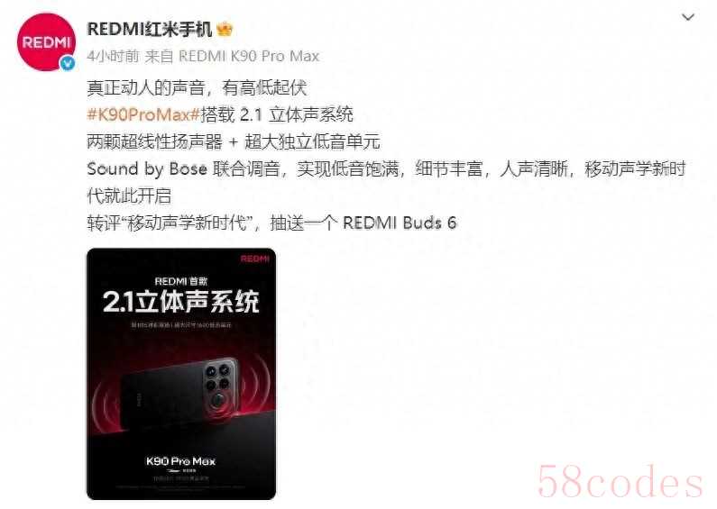 总的来说,这两点预热信息都指向了REDMI K90 Pro Max在"音频体验"和"续航能力"上的重点提升,预示着这款手机可能会在发布时吸引对这两方面有较高要求的消费者。